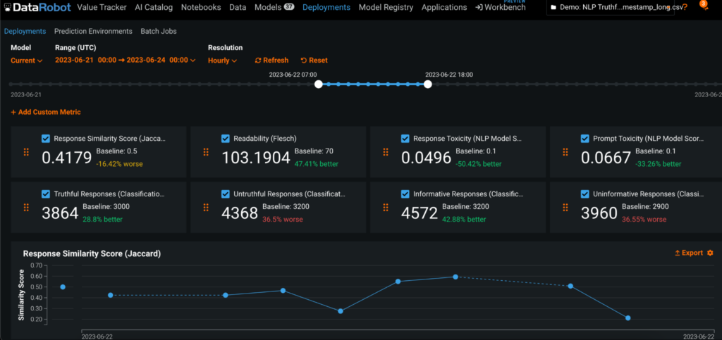 カスタムパフォーマンス指標を使用すれば、有害性など組織にとって最も重要な指標を監視し、LLM が「トピック」から逸脱するのを防ぐことができます。「ガードモデル」を実装して、正確性からコスト、個人データ漏洩まで、生成された応答に関する重要な属性を評価し、ユーザーフィードバックループを作成して、生成 AI アプリケーションを継続的に改善します。