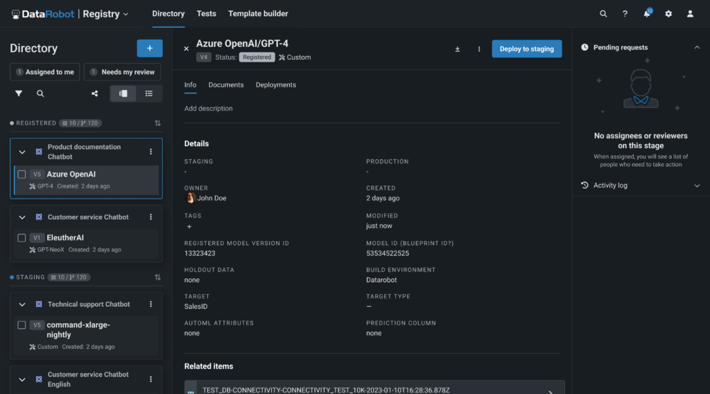 AI 環境の無秩序化を防ぎます。生成 AI モデルや予測 AI モデルが DataRobot プラットフォーム上で構築されたかどうかに関係なく、統合されたレジストリとコンソールで、AI 環境全体を信頼できる唯一の情報源と記録システムに統合します。誰がどう構築したかに関係なく、ベクターデータベース、LLM、プロンプトエンジニアリング戦略をまとめて適切に管理します。すべてのモデル変更を記録し、必要に応じて以前のバージョンに簡単に戻すことができる自動バージョン管理機能により、LLM をアップグレードし、変更を追跡できます。