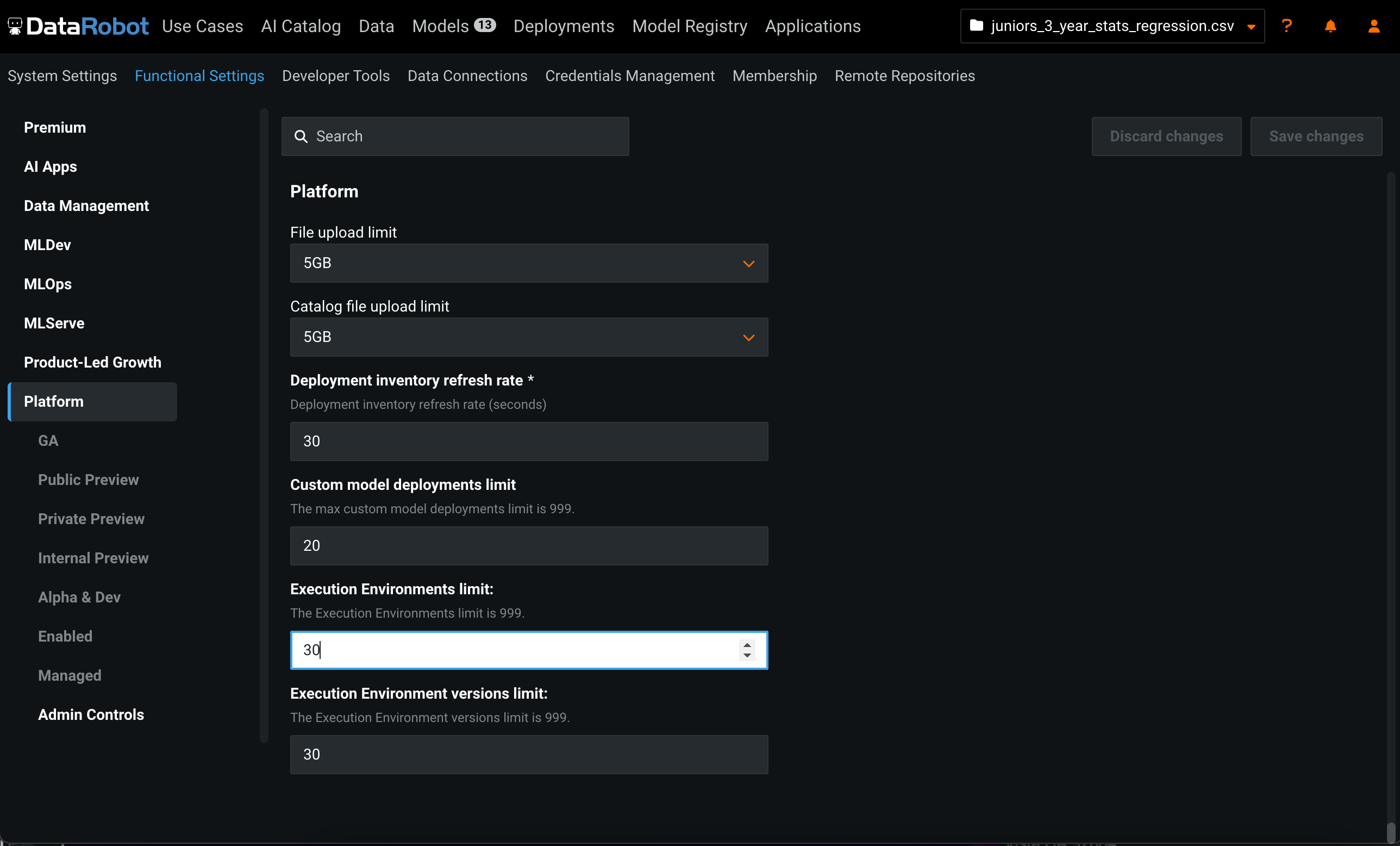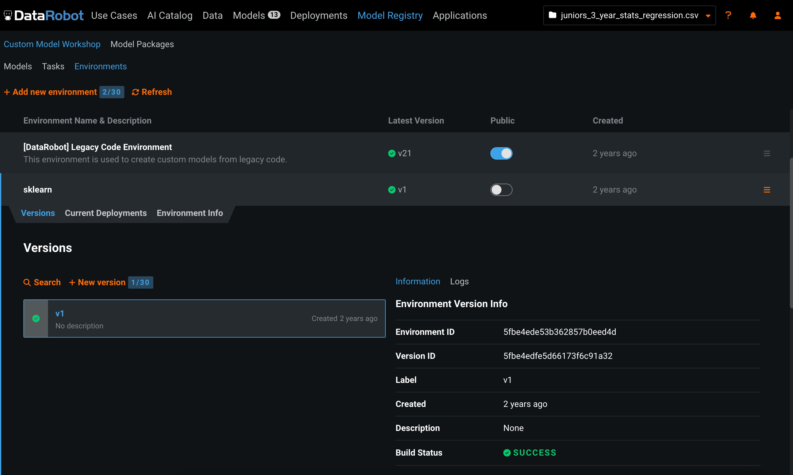 Easily manage and track custom model environments and versions through DataRobot. Environments are a powerful tool for extending DataRobot Custom Models functionality to include your favorite Data Science packages. Now you can configure the number of environments and the number of saved versions allowed for your users. These updates make the environment building process transparent and easier to manage.