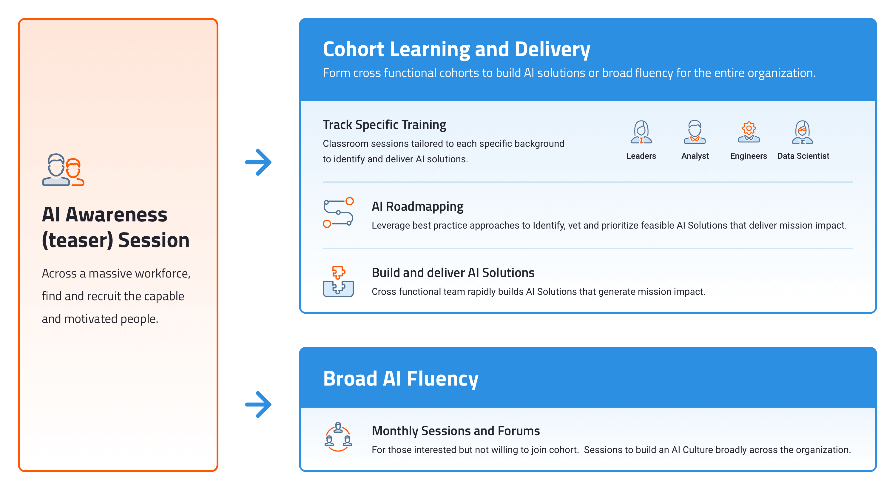 With AI fluency cultivated across your organization, your workforce would be trained to identify opportunities and deliver mission impact through AI.