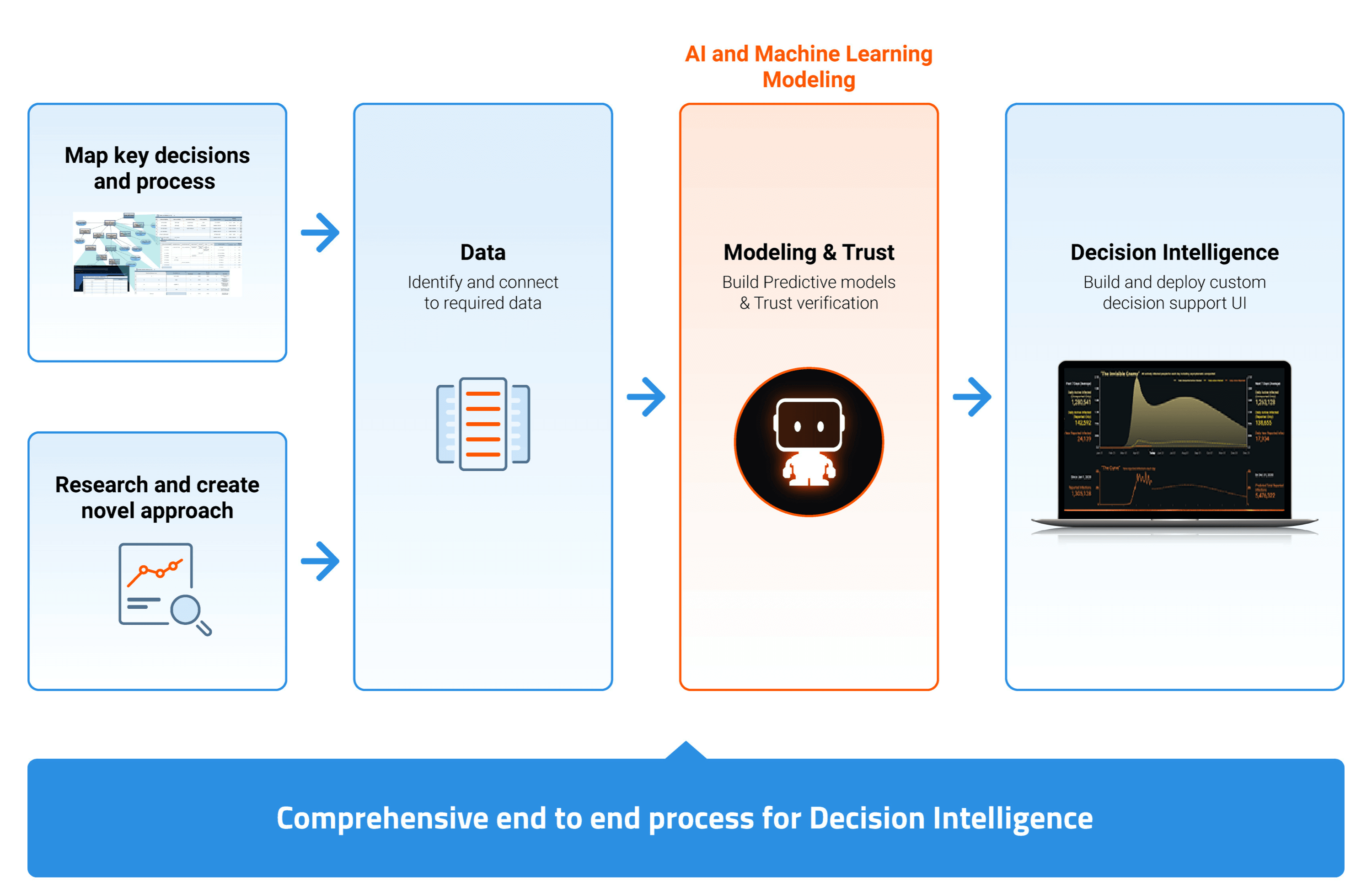 DataRobot offers a comprehensive end-to-end process for both decision intelligence and AI and Machine Learning Modeling.