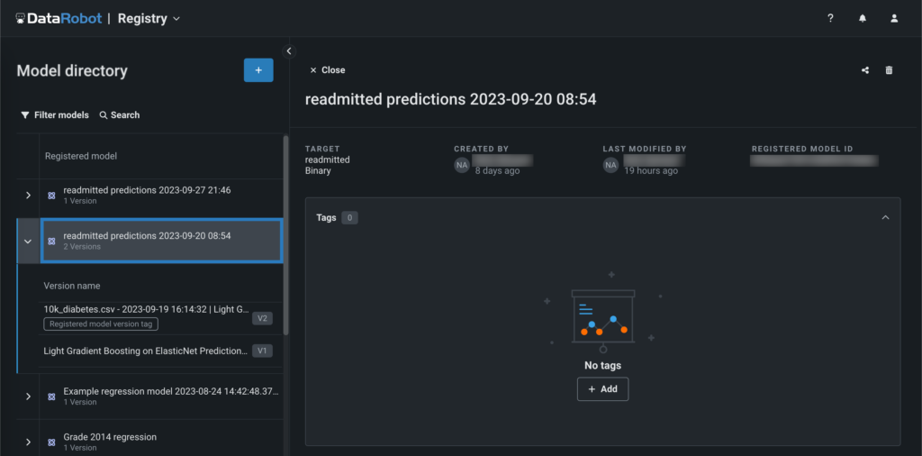 モデル登録がない状態から開始するようなことはありません。DataRobot または組織の管理者ユーザーがパブリックモデルを追加することによって、基本的なモデルはすぐに使用できるようになります。そうしたモデルを各ユーザーが登録したり、明示的に共有したりする必要はありません。