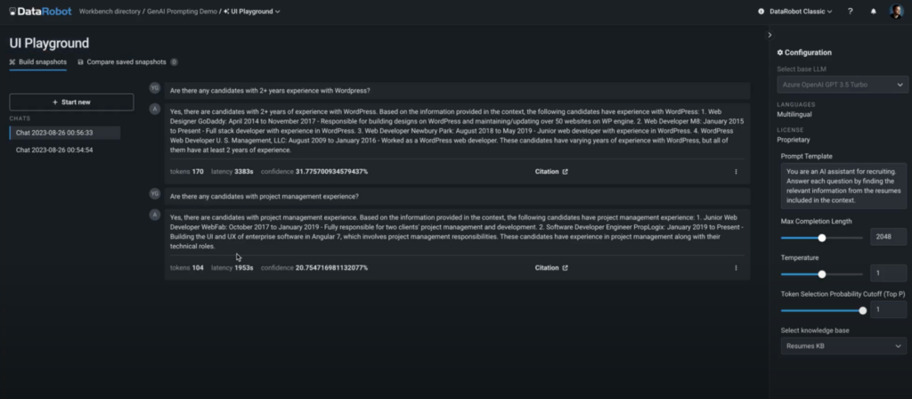 DataRobot は AI の「ブラックボックス」に光を当て、ユーザーがより細かな制御を行えるようにします。今回、プロンプトを操作して調整を加えたり、さまざまなチャンク化戦略を活用したりすることが可能になりました。口調や応答の長さなど、有用性に関わる要素を自社のニーズに完全に合わせることができます。また、多様なプロンプトをさまざまな大規模言語モデル(LLM)に送信し、ハイパーパラメーターやプロンプトテンプレートを試してみることも可能です。