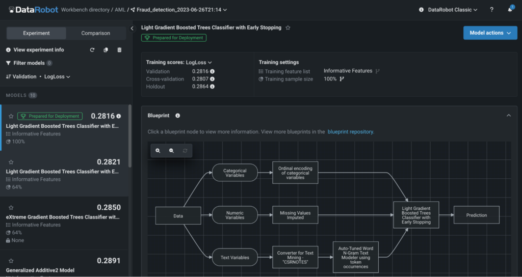 データの前処理やパラメーター設定、モデルをさまざまに組み合わせてテストし、最もパフォーマンスの高いモデルを本稼働用に選択します。